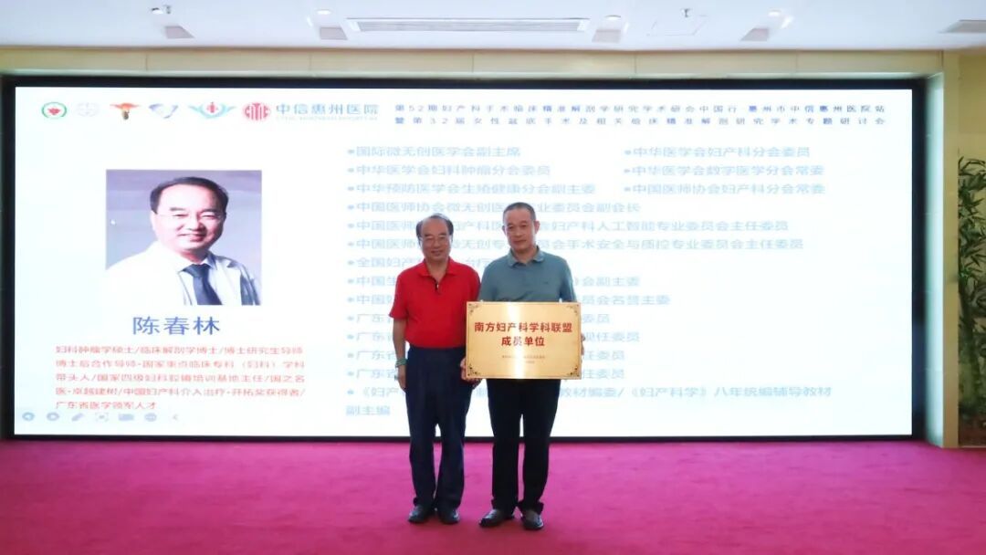 在与会人员的共同见证下,陈春林教授为中信惠州医院颁发“南方妇产科学科联盟成员单位” 的牌匾。这标志着中信惠州医院妇产科技术水平与更广阔的学术平台实现对接,将为广大女性患者提供更优质、更专业的医疗服务。