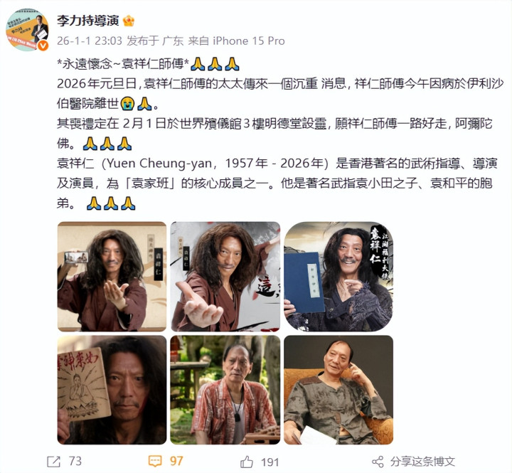 李力持发文透露噩耗,称袁祥仁的太太说袁师傅在伊利沙伯医院去世,享年68岁,丧礼定在2月1日,愿一路走好。
