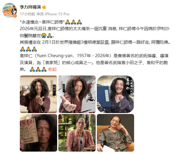 1月1日晚间,知名导演李力持在社交平台发文披露,香港资深演员、金牌武术指导袁祥仁,已于当日中午因病在香港伊利沙伯医院离世,享年69岁。这则来自袁祥仁妻子的讣告,让无数影迷猝不及防,网友们纷纷留言缅怀,送别这位陪伴几代人成长的银幕老友。