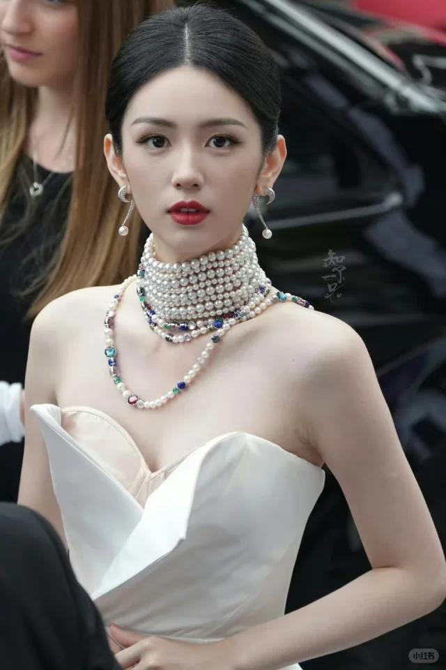像下面这张造型,是她出席戛纳电影节的造型,白色抹胸裙搭配珍珠项链就像是古堡里走出来的公主。